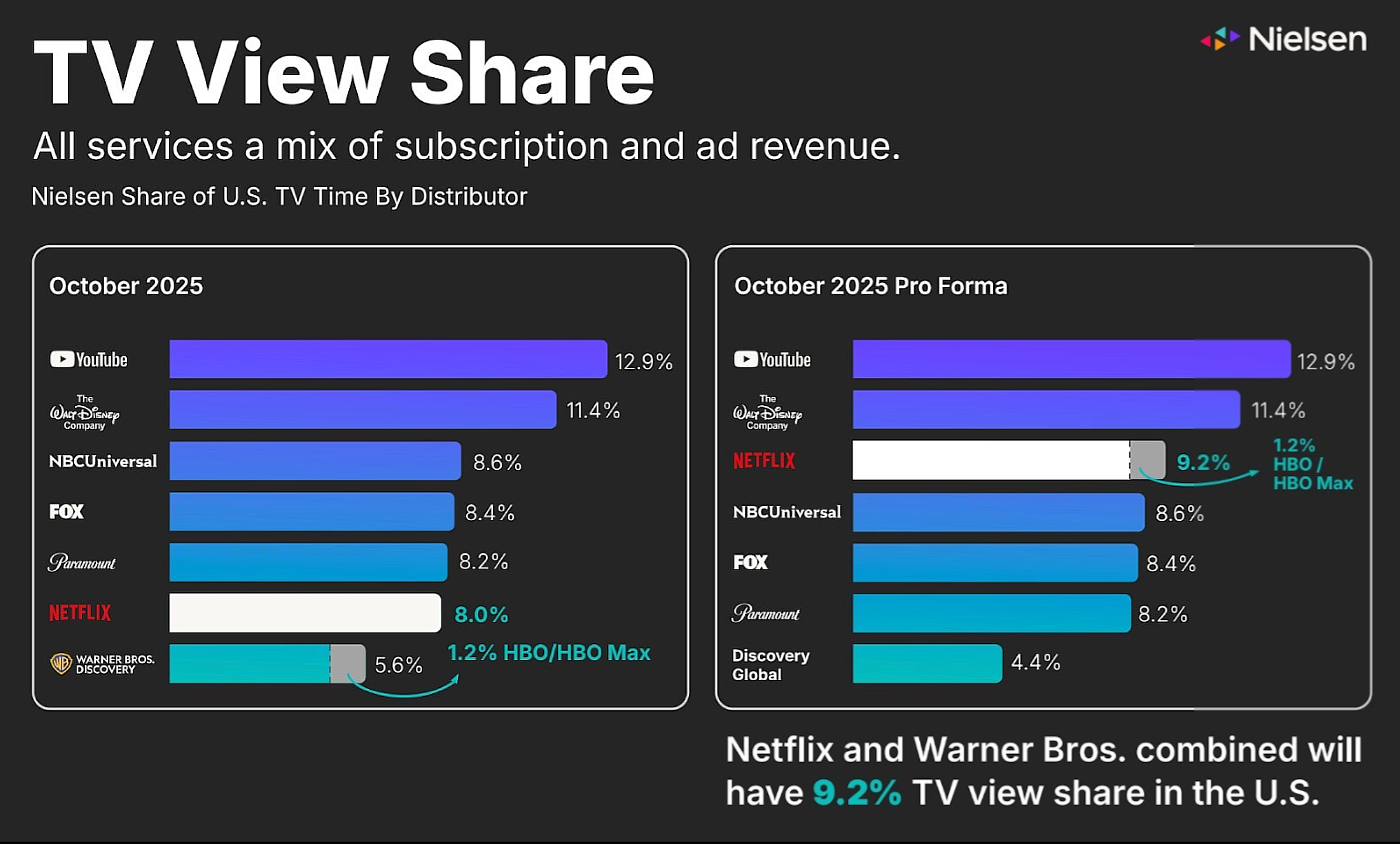 Le 5 décembre, Netflix et WBD ont annoncé un accord définitif pleinement négocié et financé, aux termes duquel Netflix fera l’acquisition de Warner Bros., y compris ses studios de cinéma et de télévision, HBO Max et HBO. La transaction en numéraire et en actions est valorisée à 27,75 dollars par action WBD, pour une valeur d’entreprise totale d’environ 82,7 milliards de dollars (dont 72,0 milliards de dollars de valeur des capitaux propres).